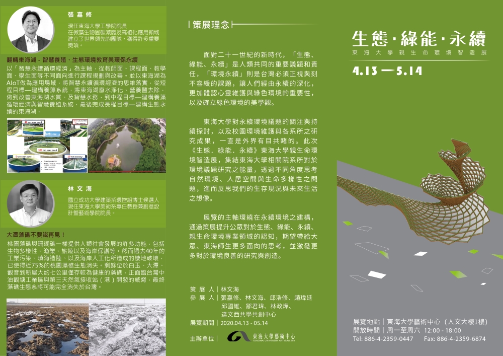 The core theme of this exhibition was the construction of a sustainable environment. Through the display and promotion, awareness on ecology, green energy, sustainability, and pro-life environment were brought to the attention of the public and students of Tunghai University so as to stimulate more environment-friendly research and creation.