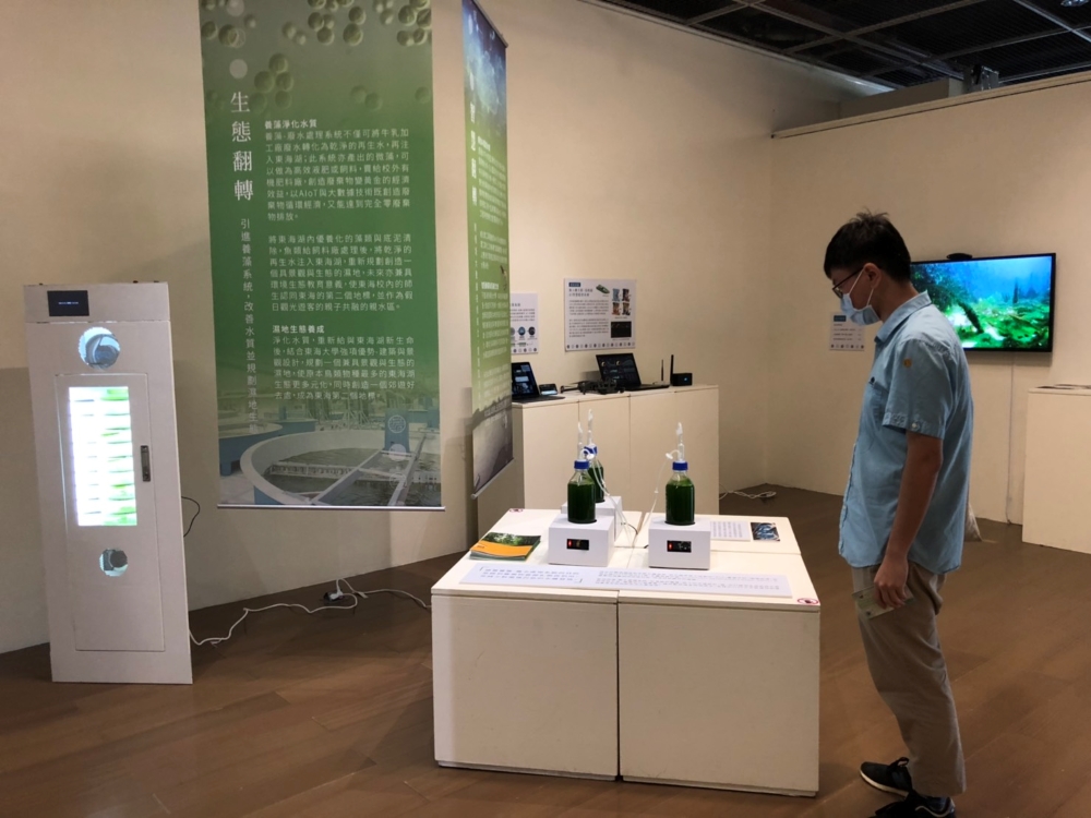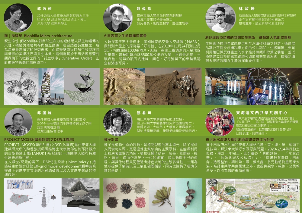 The exhibition presented an environment improvement plan for Tungda Creek jointly carried out by the Taichung City Government and Tunghai University; an AIoT project of the College of Engineering using Tunghai Lake and its surrounding area as the application field; Project Moses of the Architecture Department providing a different perspective on the destruction of water resources and the deterioration of historical villages in ancient civilization; Biophilia Micro Architecture of the Architecture Department transforming natural bio-wisdom into architectural forms while discovering the aesthetic order and symbiotic essence of reason and emotion from nature; Never-Say-Goodbye Project of the Fine Arts Department showing the biodiversity of algal reef environment at Taoyuan; high resolution panorama sketch of Mars captured by Curiosity Rover introduced by Life Science Department; the Seed Project of the Landscape Design Department demonstrating the biodiversity of the earth based on a seed; a closed ecosystem of geodesic dome structure of the International College experimenting the Sabatier reaction and using ionic liquids to decompose polysaccharides, in an attempt to create a real living environment.