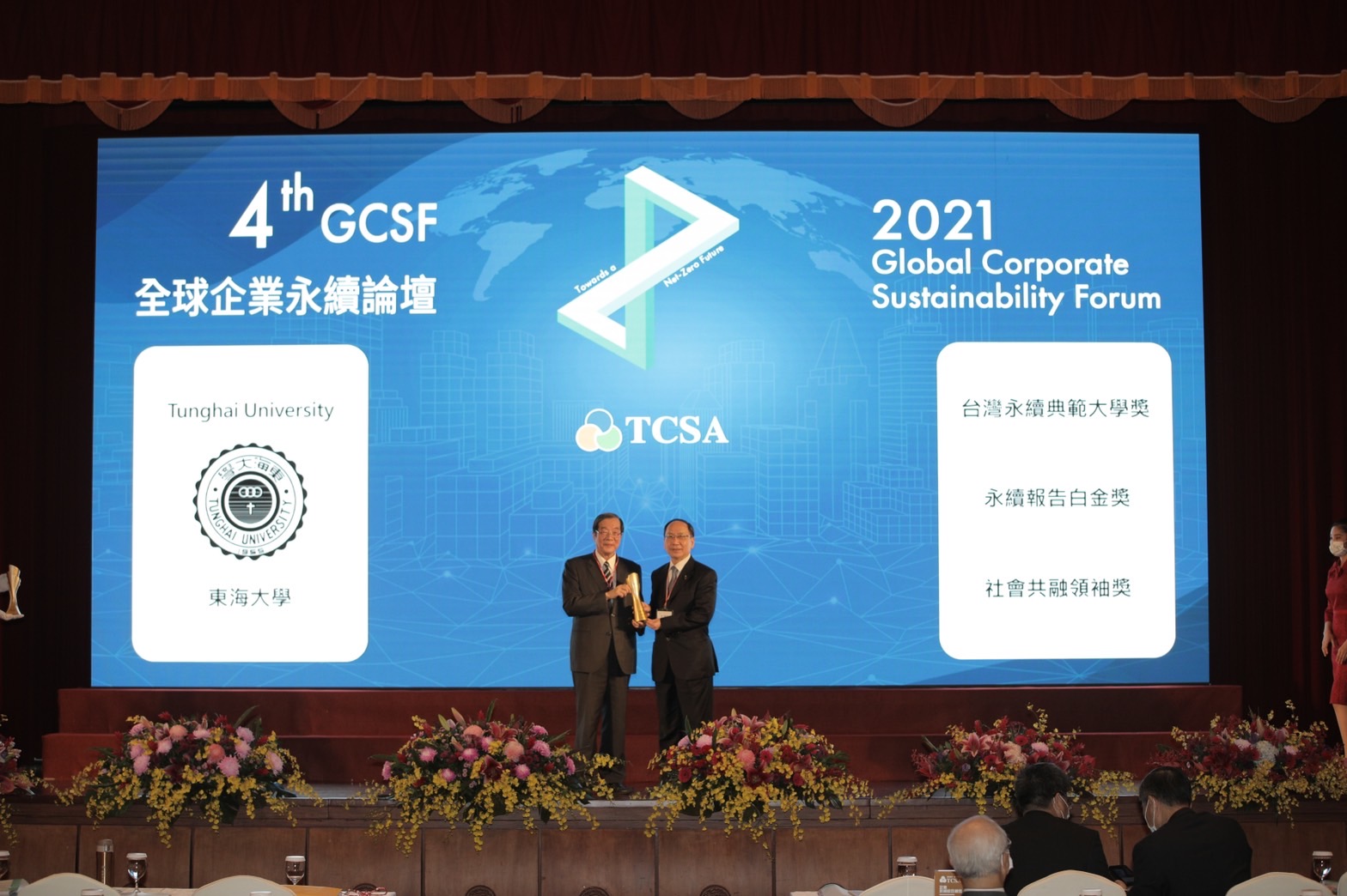 The 2021 Taiwan Corporate Sustainability Awards (TCSA) were announced on November 17. This year, Tunghai University was granted with highest honor in Overall Sustainability Performance, Sustainability Report, and Single Topic Performance. Tunghai University President Mao-Jiun Wang, Vice President Chia-Chung Chan, Institutional Research Officer Shu-Ming Hsu, and Corporate Sustainability Influence Center Director Chia-Wei Hsu attended the ceremony to receive the awards.