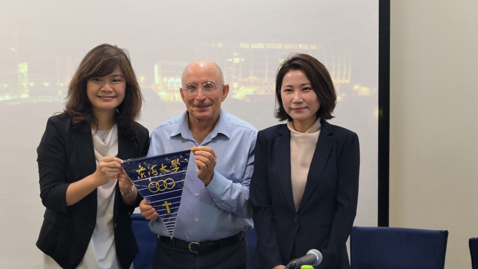 Tunghai University Ying-Chyi Chou presents Tunghai bannerette to University of Haifa President Ron Robin (Center), Representative of Taipei Economic and Cultural Office in Tel- Aviv Ya-Ping Lee on the right